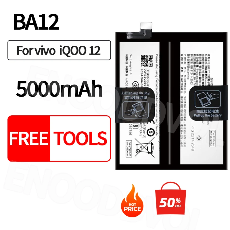100% NEW 5000mAh Battery for Vivo IQOO 12 High Capacity Long-lasting Battery with Free Tools BA12 Battery