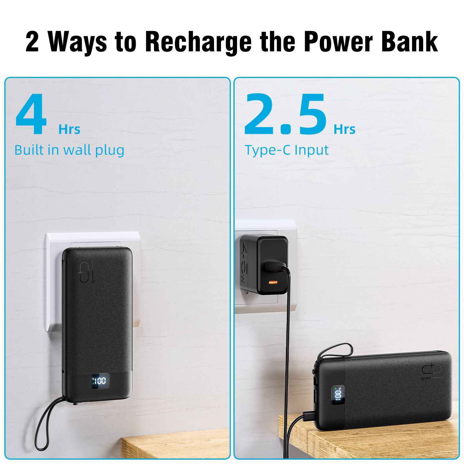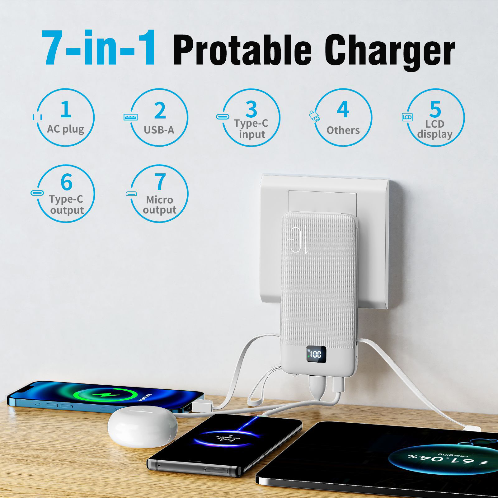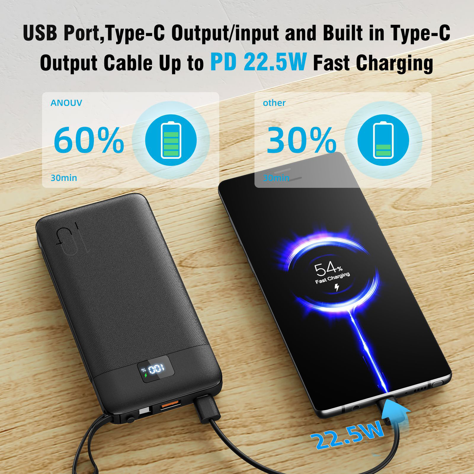 1PCS 10000mAh Portable Power Chargers-22.5W Fast Charging Power Bank Built in Cables and Wall Plug, Smart LED Display Slim Travel Battery Pack for Samsung Google LG Moto iPhone iPad