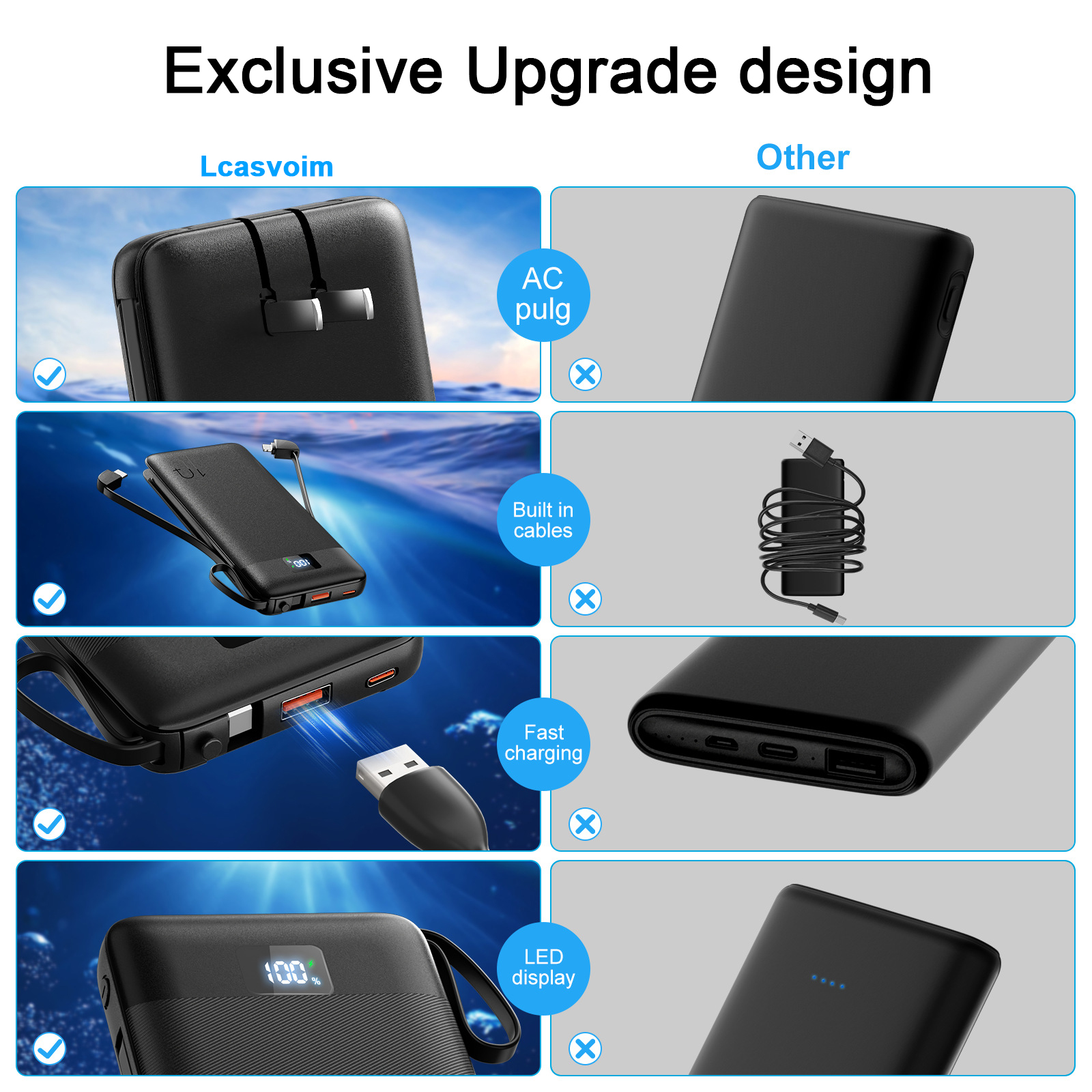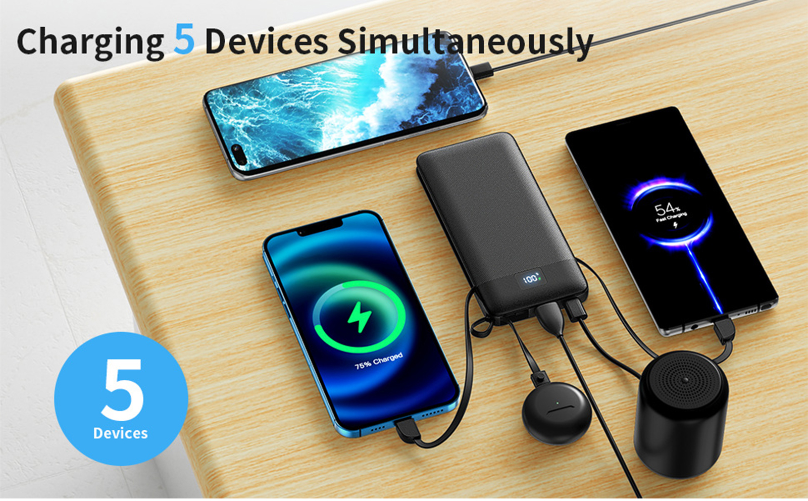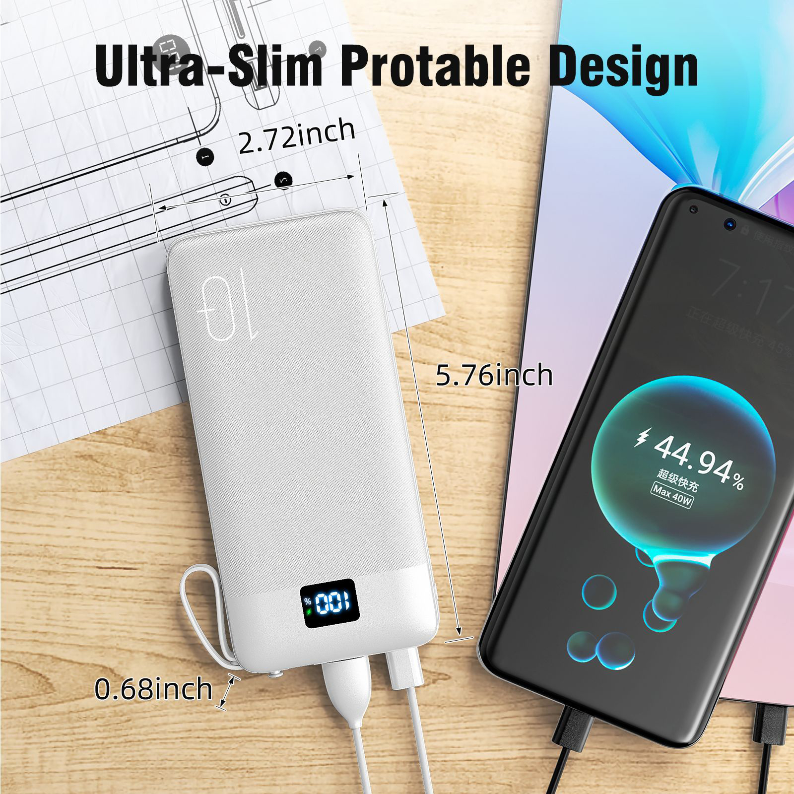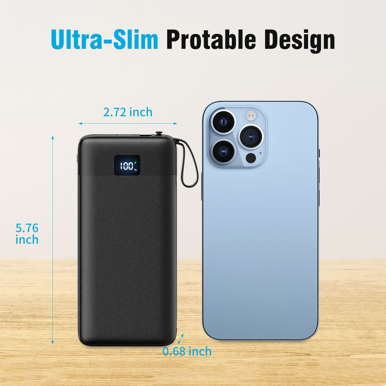 1PCS 10000mAh Portable Power Chargers-22.5W Fast Charging Power Bank Built in Cables and Wall Plug, Smart LED Display Slim Travel Battery Pack for Samsung Google LG Moto iPhone iPad