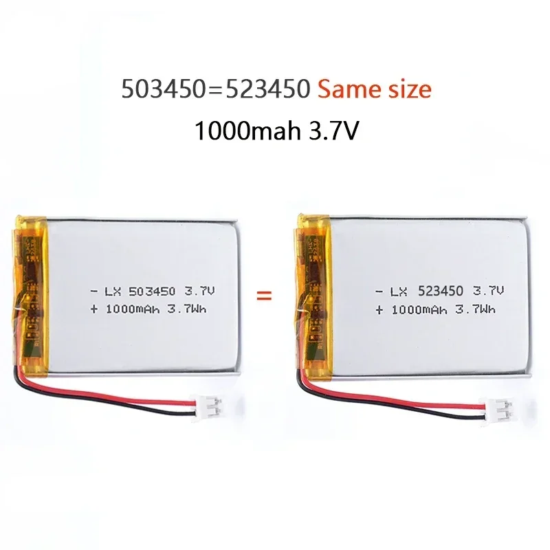 503450/523450 1000mAh 3.7V Polymer Lithium Rechargeable Battery Li-ion Battery JST PH2.0 2pin For GPS Smart Phone DVD MP4 MP5